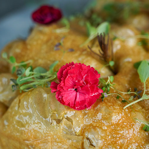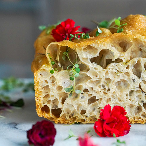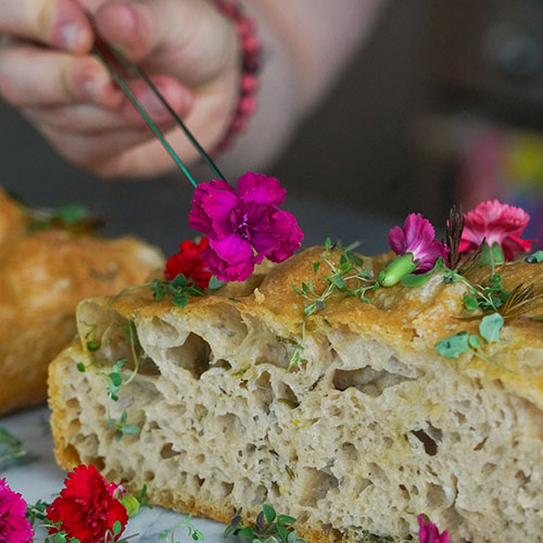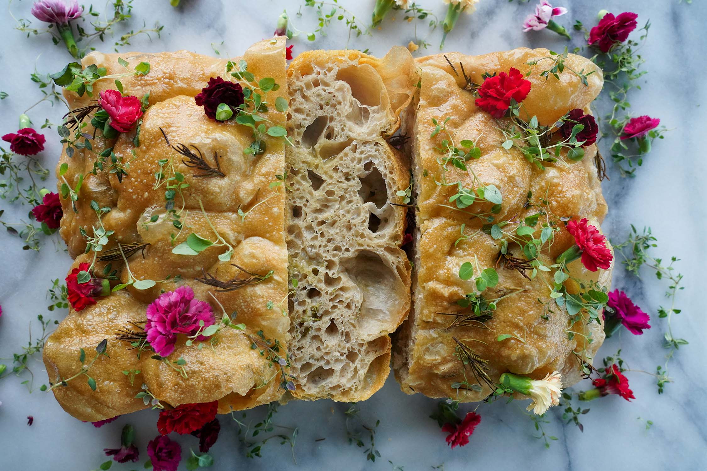 Rosemary Focaccia with Edible Flowers Carnation, Micro Thyme, Micro Oregano, Rosemary Tops, Red Fife Whole Wheat, and Olive Oil